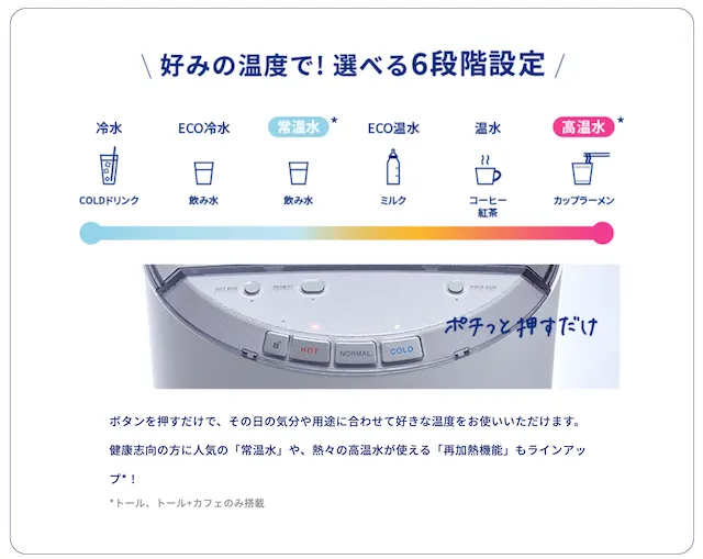 機能 | 冷水・温水、UV-LED殺菌、ECO機能、静音設計 |